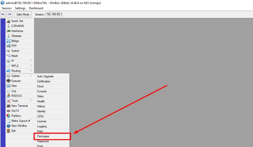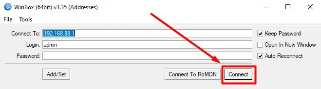 Подключитесь к роутеру Mikrotik через WinBox или веб-интерфейс (IP по умолчанию: 192.168.88.1). Для стабильности подключения используйте MAC-адрес.
