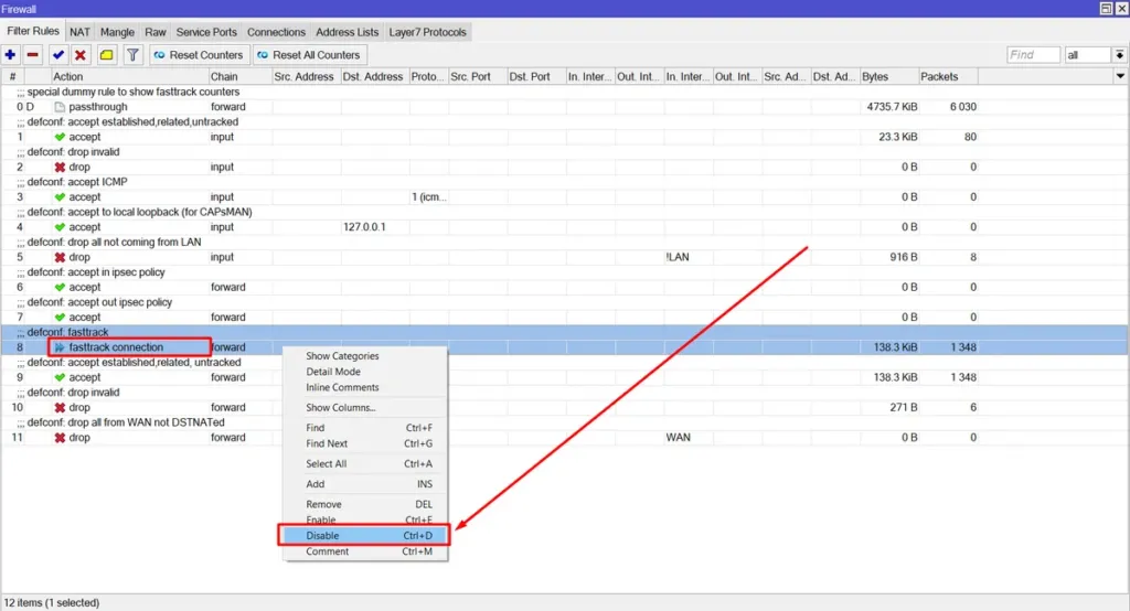 - В IP → Firewall → Filter Rules включите правило Fasttrack.