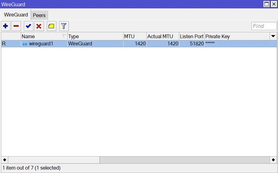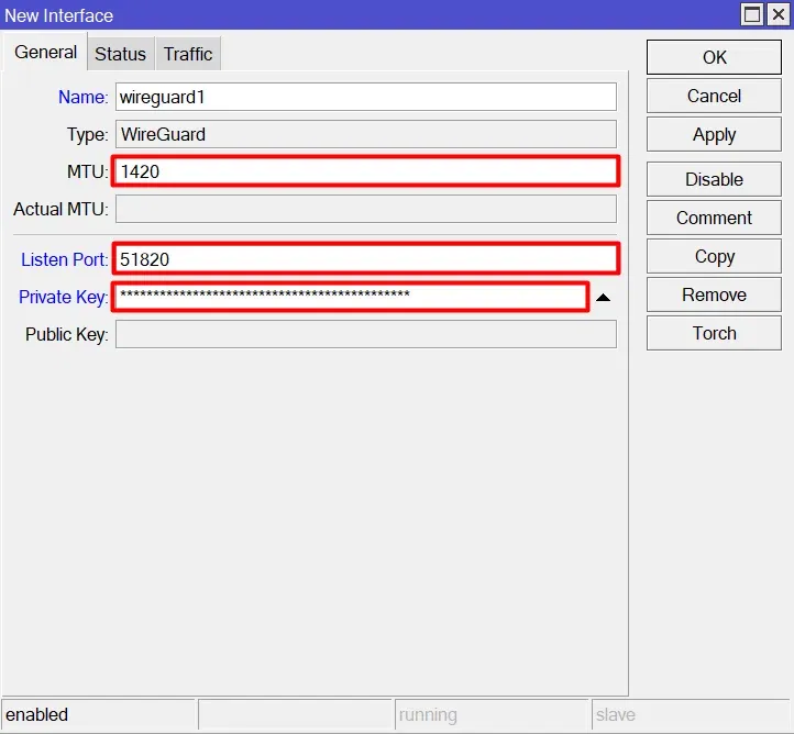 Укажите MTU (по умолчанию 1420), Listen Port и Private Key из конфигурации сервера WireGuard. Нажмите OK.
