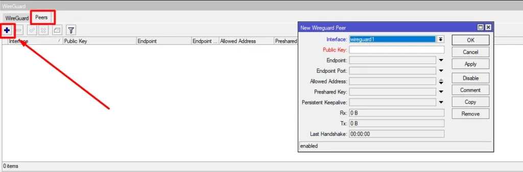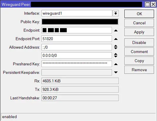 Выберите созданный интерфейс, заполните Public Key, Endpoint, Endpoint Port, Preshared Key из конфигурации сервера. Укажите Allowed Address: 0.0.0.0/0 для доступа ко всем подсетям.