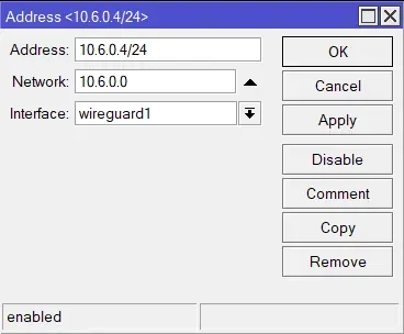 - Укажите Address (IP клиента из конфигурации), Network (то же, но последняя цифра 0), Interface (WireGuard).