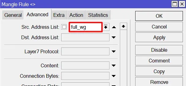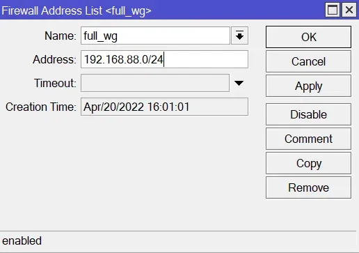Укажите Name: full_wg, Address: 192.168.88.0/24 (локальная сеть роутера). Нажмите OK.