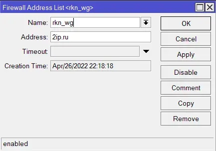 Укажите Name: rkn_wg, Address: имя сайта (например, 2ip.ru) или его IP. Нажмите OK.