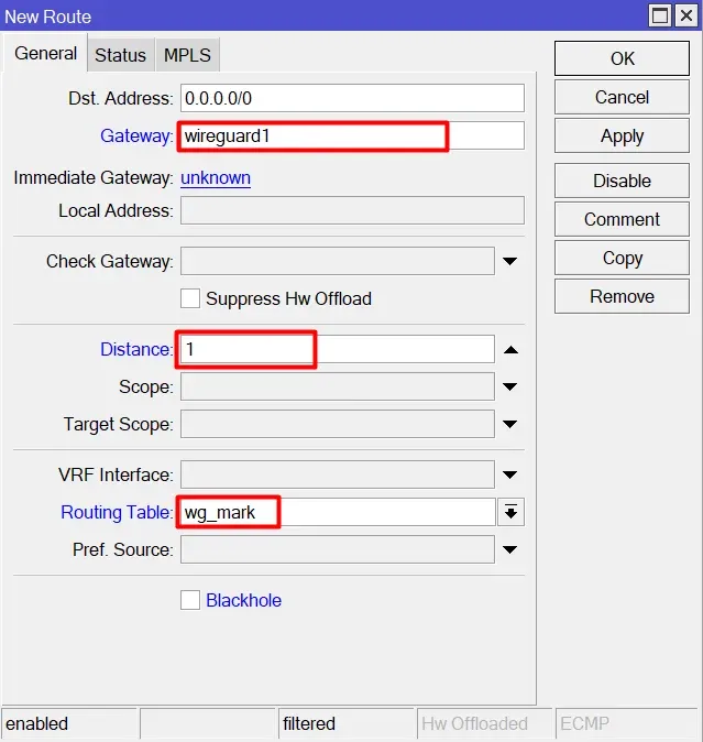 - Gateway: wireguard1 (имя интерфейса WireGuard)