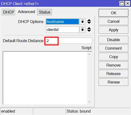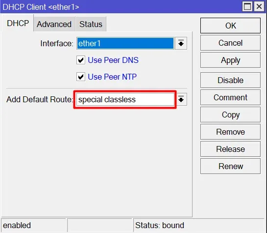 - В IP → DHCP Client измените Add Default Route на Yes и Default Route Distance на 1.