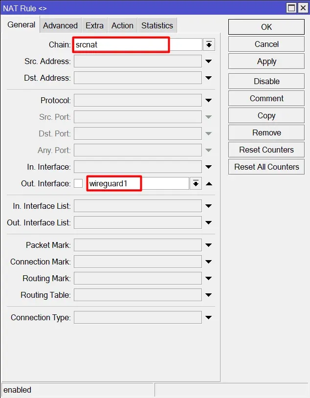 - В IP → Firewall → Nat удалите правило с Out. Interface: wireguard1 и Action: masquerade.