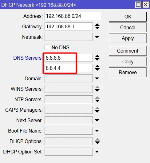 - Если Mikrotik некорректно определяет IP сайтов, измените DNS в IP → DNS (например, на 8.8.8.8 или DNS сервера WireHole).
