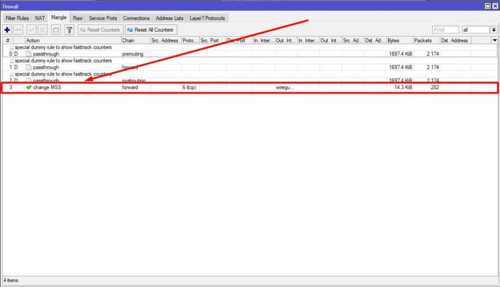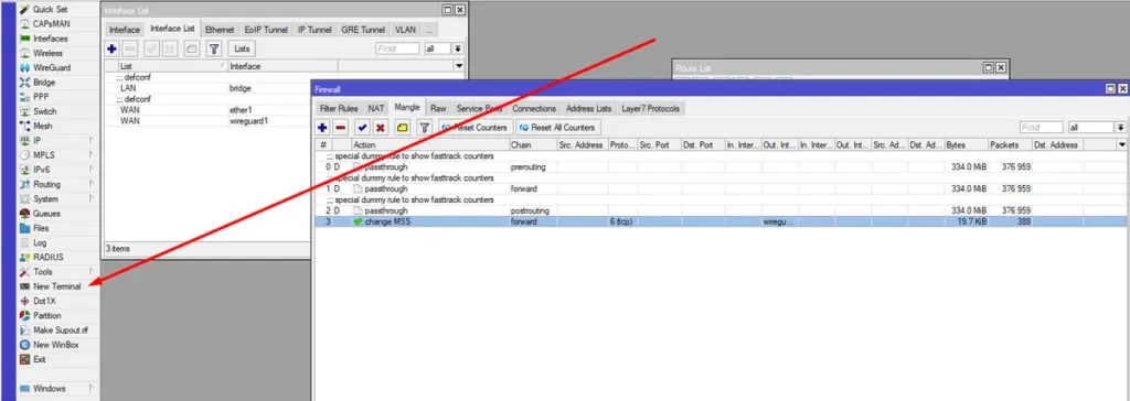 - В IP → Firewall → Mangle удалите правило с action=change-mss и out-interface=wireguard1.