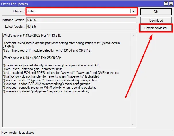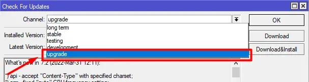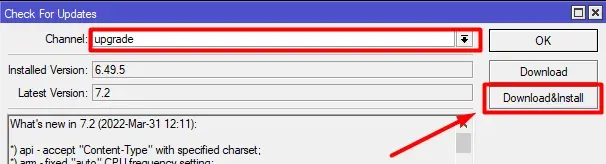 Для перехода на RouterOS 7 выберите Channel: upgrade и нажмите Download&Install.