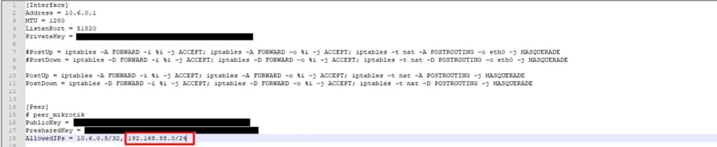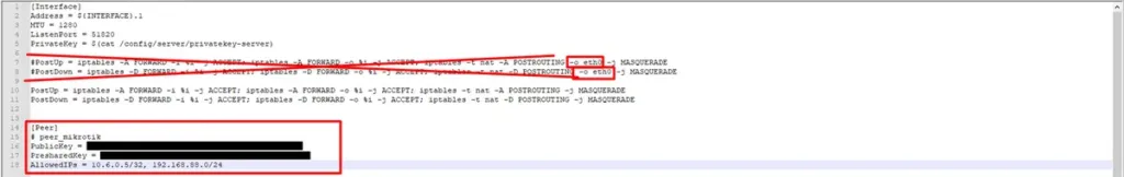 - Добавьте конфигурацию Peer для Mikrotik в конец файла (скопируйте из